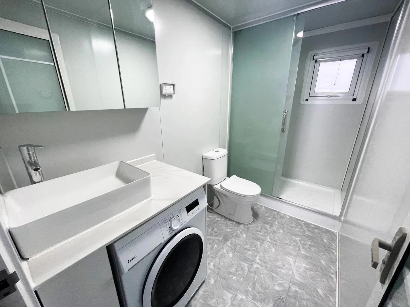 Our bathrooms are a standout feature, designed with spaciousness and functionality in mind. They include a full-sized shower, ample enough for assisted showering or for using a shower chair. Unlike capsule-style bathrooms, which are cramped and uncomfortable for most adults, our bathrooms offer a comfortable and practical solution. We also provide provisions for installing a washing machine under the sink, complete with waste, power, and water outlets.